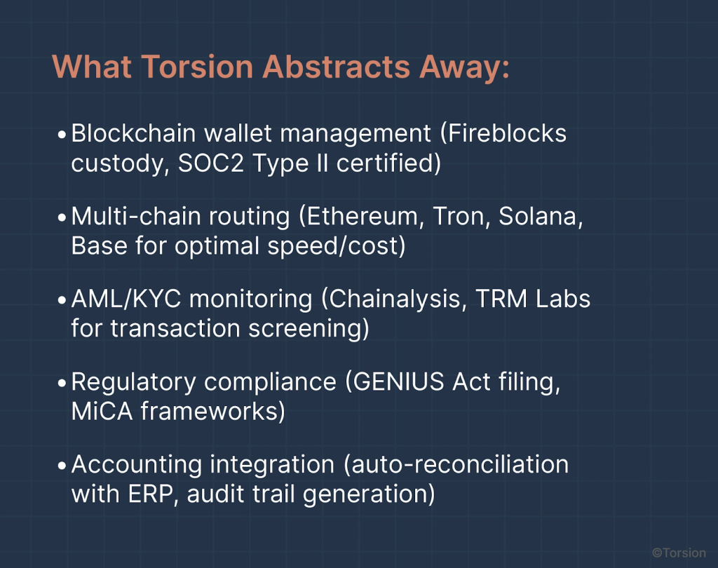 “We found Torsion,they’re like the enterprise abstraction layer for stablecoin infrastructure. They handle custody partnerships, regulatory compliance, AML/KYC monitoring, and provide REST APIs that plug directly into existing treasury management systems. Our IT team integrated it in three weeks instead of six months.”